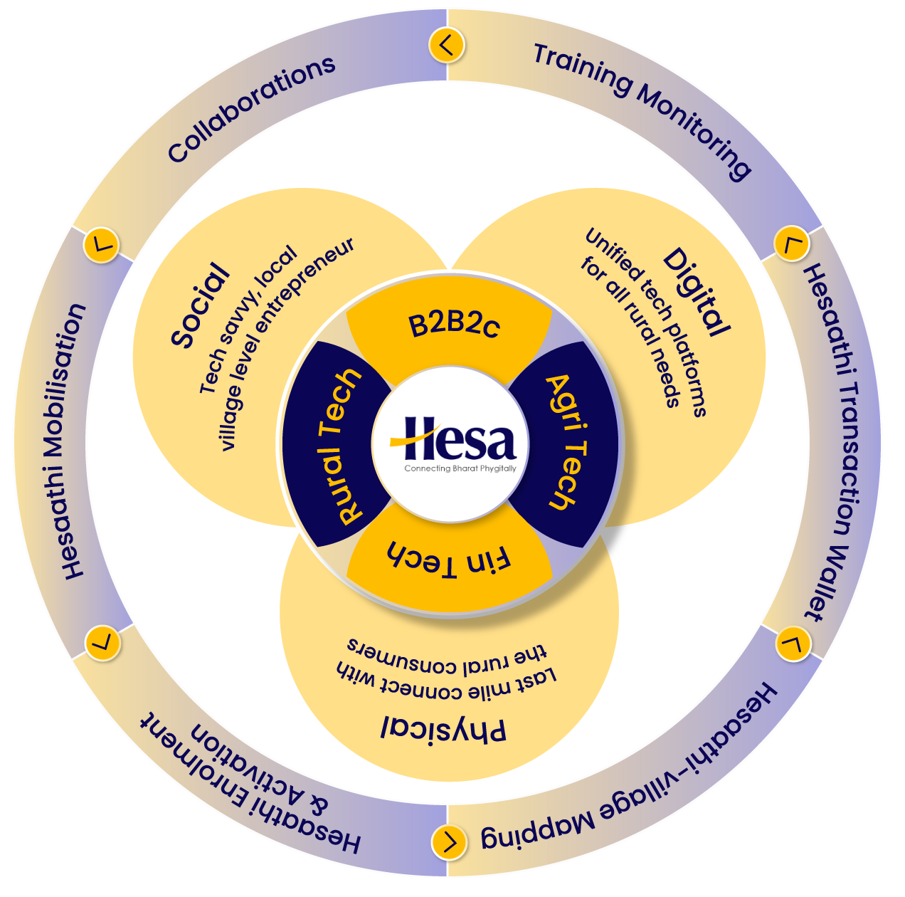 Our Hesaathis, spread across villages are connected digitally through Hesa’s Tech platform. Through Hesa, the rural entrepreneur at the village level, becomes a one stop aggregator for a wide portfolio of products and services including financial transactions and bill payments.